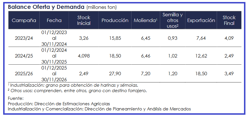 La propia Secretaría de Agricultura, Ganadería y Pesca de la Nación proyecta que en 2025/26 el procesamiento interno de trigo sería de 7,20 millones de toneladas versus 6,46 y 6,45 millones en los dos ciclos inmediatos anteriores.